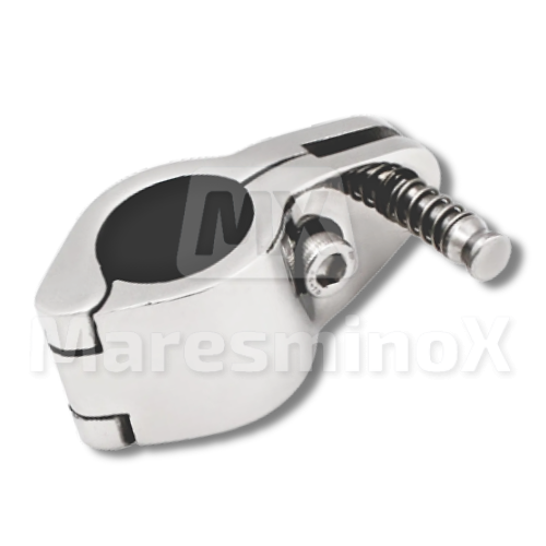 Función: es un accesorio diseñado para crear un punto de pivote en estructuras tubulares, permitiendo que un toldo o una capota se pliegue y despliegue. A diferencia del modelo básico, este accesorio incluye un pasador que facilita el desmontaje rápido. Sirve como punto de articulación y bisagra desmontable, lo que permite plegar y retirar la capota sin herramientas.
